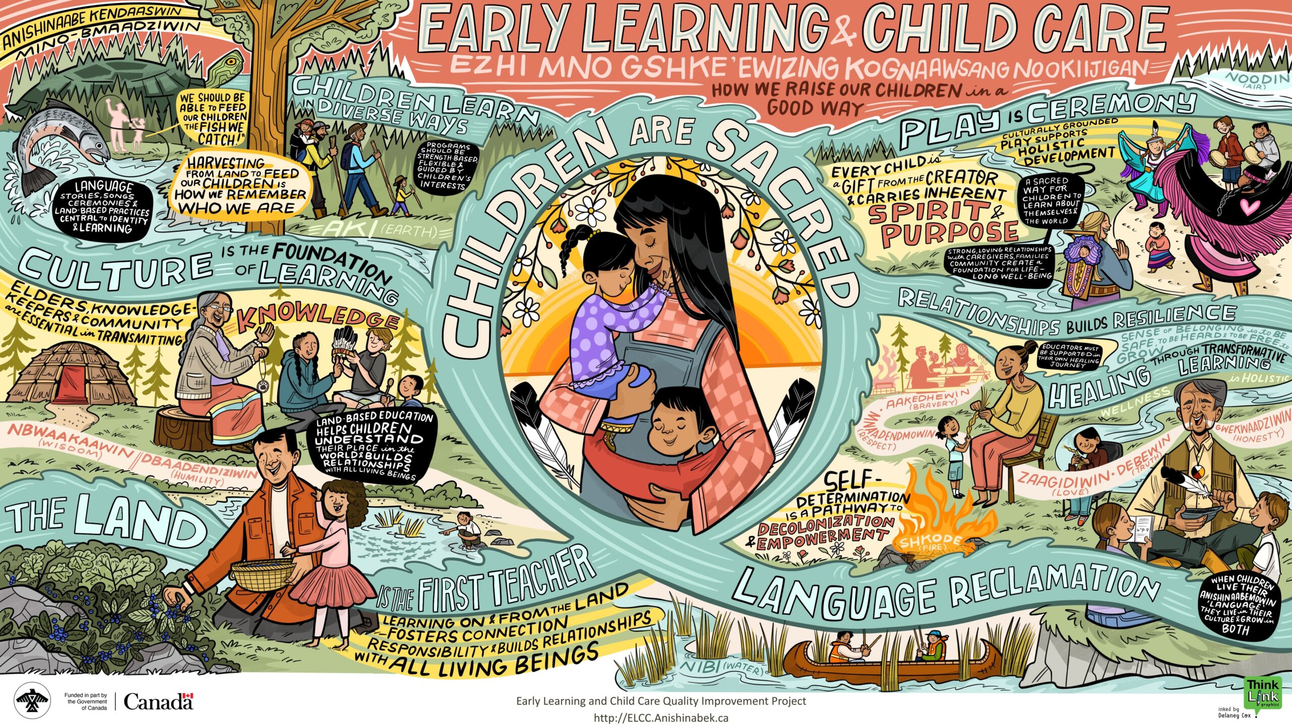 These collaborative circles were part of the Ezhi-Mno-Gshke’ewizing Kognaawsang Nookiijigan (How We Raise Our Children in a Good Way Project) which is an initiative that brought communities together to share knowledge, values, and aspirations for high-quality Indigenous early learning and childcare. From these rich conversations, the Early Learning and Child Care Quality Improvement Project team captured community-driven wisdom and partnered with artist Delaney Cox of Think Link Graphics™ to create a visual story map ‘a dynamic representation of the shared vision and commitment to high-quality early learning’. This visual story map reflects the principles and priorities that emerged from those conversations.